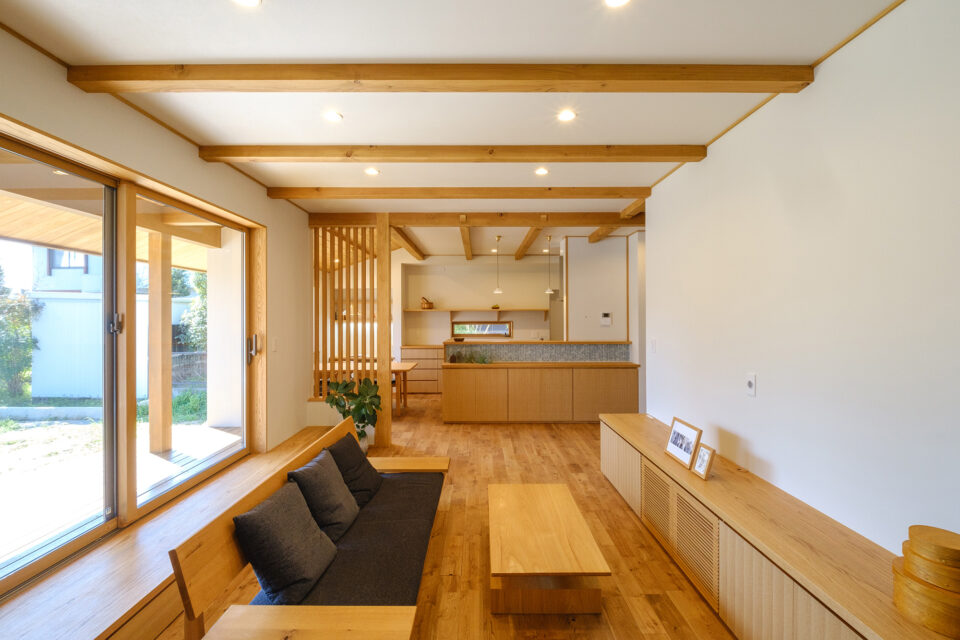 南面の掃き出し窓下にはベンチを造作。洗面台やカップボードも造作しこだわりつまった空間となっています。